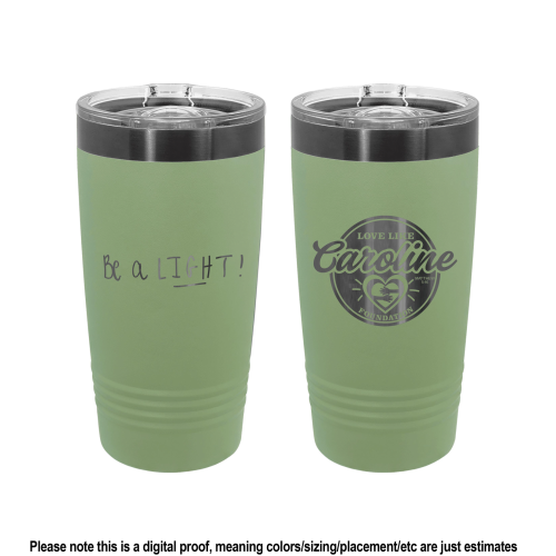 20 oz. Stainless Steel Polar Camel Tumblers feature double-wall vacuum insulation with a clear lid. The mug has a narrower bottom to fit most standard cup holders. It is 2X heat & cold resistant compared to a normal tumbler. Polar Camels are made from 18/8 gauge stainless steel (18% chromium/8% nickel) - also known as Type 304 Food Grade. Laser Engraved Designs